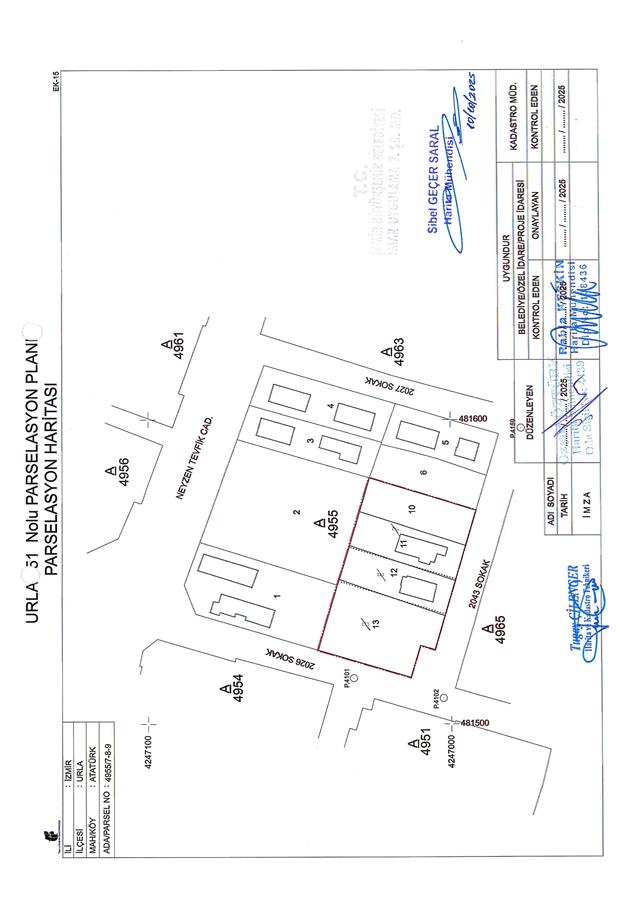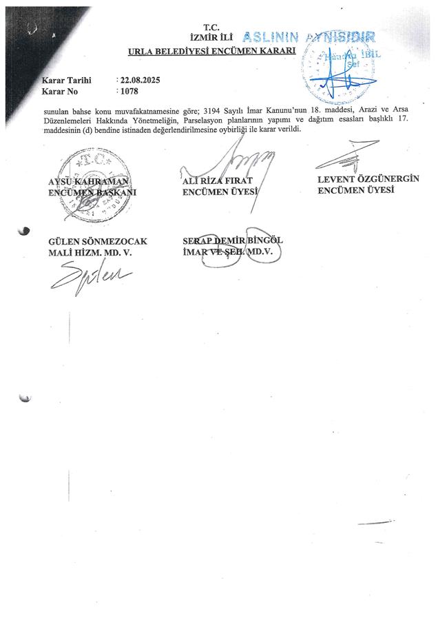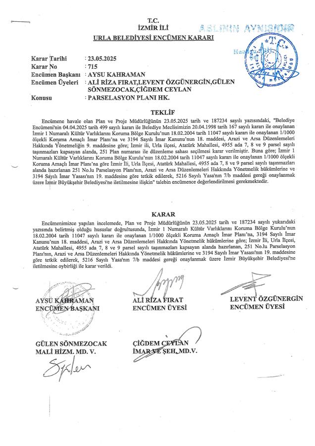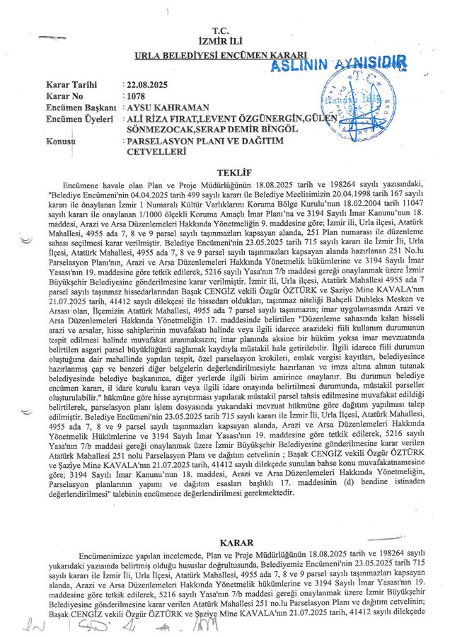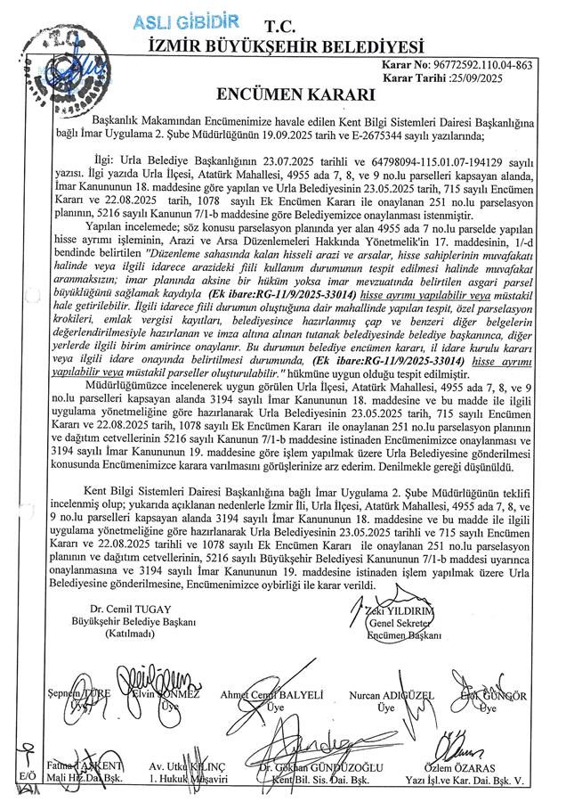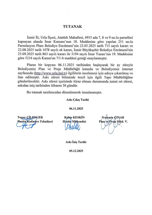 İzmir İli, Urla İlçesi, Atatürk Mahallesi, 4955 ada 7, 8 ve 9 no.lu parselleri kapsayan alanda İmar Kanunu’nun 18. Maddesine göre yapılan 251 no.lu Parselasyon Planı Belediye Encümeni’nin 23.05.2025 tarih 715 sayılı kararı ve 22.08.2025 tarih 1078 sayılı ek kararı, İzmir Büyükşehir Belediye Encümeni'nin 25.09.2025 tarih 863 sayılı kararı ile 3194 sayılı İmar Yasası’nın 19. Maddesine göre 5216 sayılı Kanun'un 7/1-b maddesi gereği onaylanmıştır.