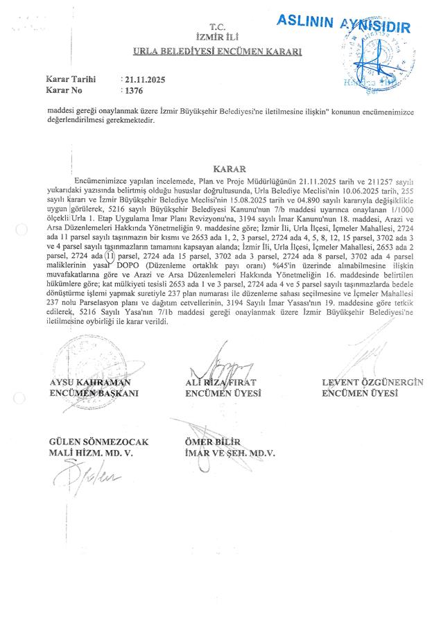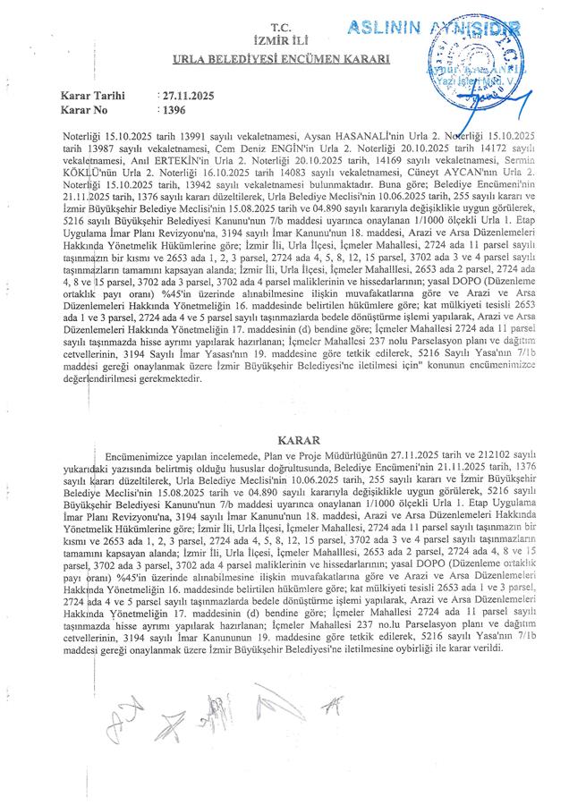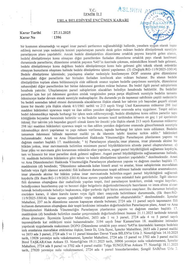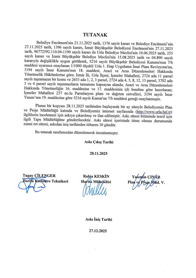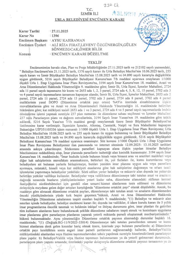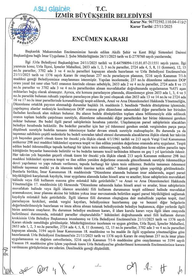 Belediye Encümeni'nin 21.11.2025 tarih, 1376 sayılı kararı ve Belediye Encümeni’nin 27.11.2025 tarih, 1396 sayılı kararı, İzmir Büyükşehir Belediyesi Encümeni'nin 27.11.2025 tarih, 96772592.110.04-1190 sayılı kararı ile Urla Belediye Meclisi'nin 10.06.2025 tarih, 255 sayılı kararı ve İzmir Büyükşehir Belediye Meclisi'nin 15.08.2025 tarih ve 04.890 sayılı kararıyla değişiklikle uygun görülerek, 5216 sayılı Büyükşehir Belediyesi Kanunu'nun 7/b maddesi uyarınca onaylanan 1/1000 ölçekli Urla 1. Etap Uygulama İmar Planı Revizyonu'na, 3194 sayılı İmar Kanunu'nun 18. maddesi, Arazi ve Arsa Düzenlemeleri Hakkında Yönetmelik Hükümlerine göre; İzmir İli, Urla İlçesi, İçmeler Mahallesi, 2724 ada 11 parsel sayılı taşınmazın bir kısmı ve 2653 ada 1, 2, 3 parsel, 2724 ada 4, 5, 8, 12, 15 parsel, 3702 ada 3 ve 4 parsel sayılı taşınmazların tamamını kapsayan alanda; Arazi ve Arsa Düzenlemeleri Hakkında Yönetmeliğin 16. maddesine ve 17. maddesinin (d) bendine göre hazırlanan; İçmeler Mahallesi 237 no.lu Parselasyon planı ve dağıtım cetvelleri, 3194 sayılı İmar Yasası’nın 19. maddesine göre 5216 sayılı Kanun'un 7/b maddesi gereği onaylanmıştır.