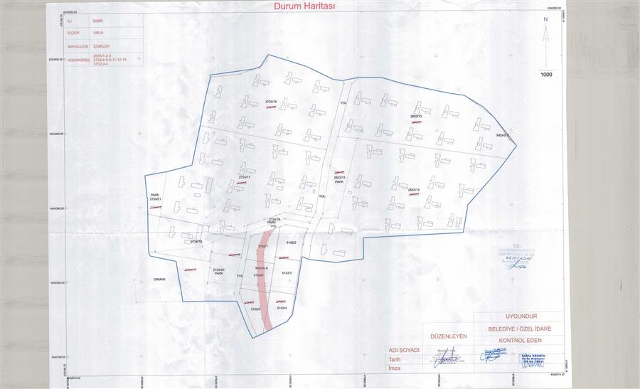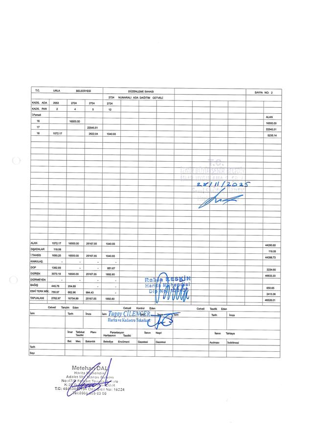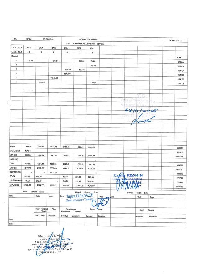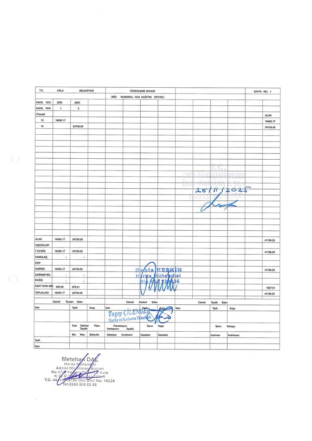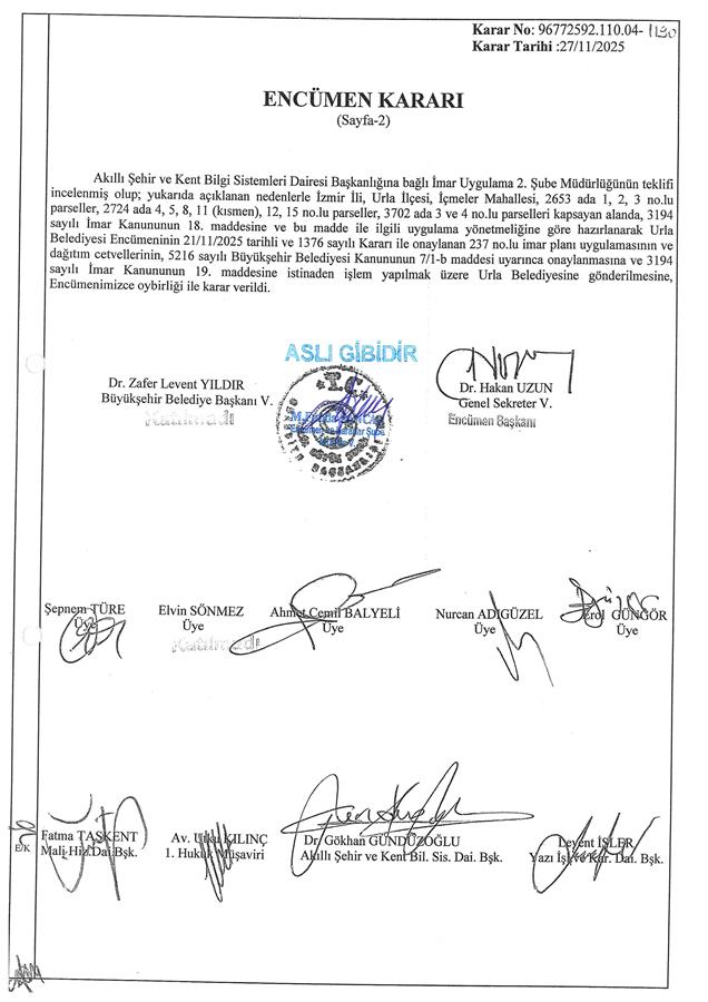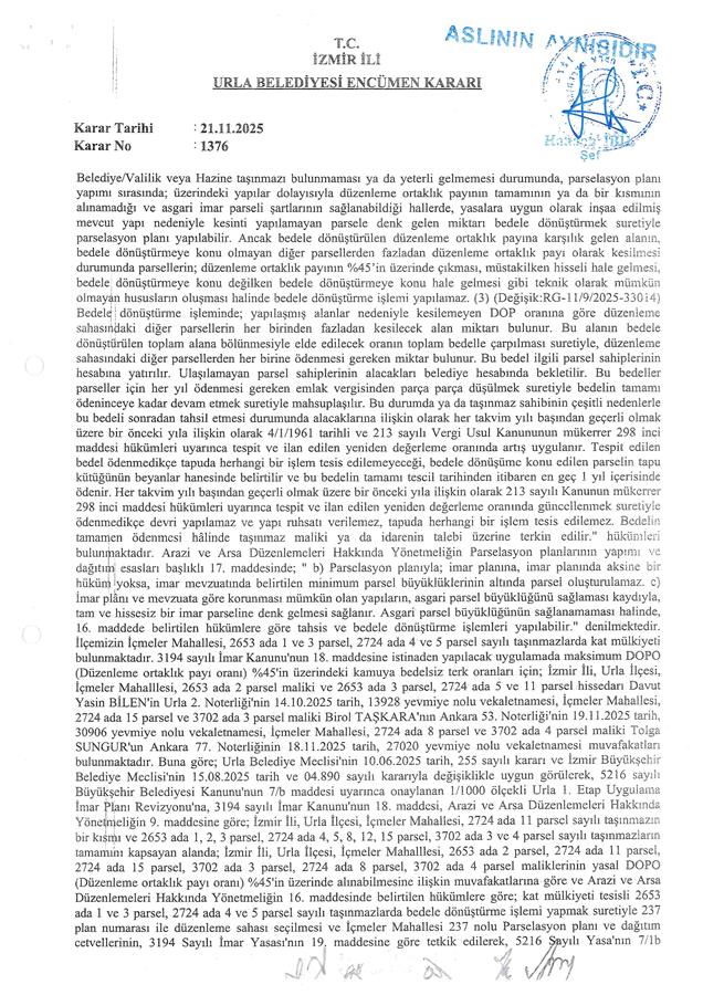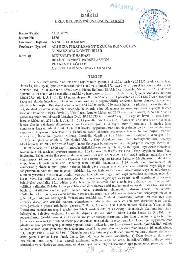 Belediye Encümeni'nin 21.11.2025 tarih, 1376 sayılı kararı ve Belediye Encümeni’nin 27.11.2025 tarih, 1396 sayılı kararı, İzmir Büyükşehir Belediyesi Encümeni'nin 27.11.2025 tarih, 96772592.110.04-1190 sayılı kararı ile Urla Belediye Meclisi'nin 10.06.2025 tarih, 255 sayılı kararı ve İzmir Büyükşehir Belediye Meclisi'nin 15.08.2025 tarih ve 04.890 sayılı kararıyla değişiklikle uygun görülerek, 5216 sayılı Büyükşehir Belediyesi Kanunu'nun 7/b maddesi uyarınca onaylanan 1/1000 ölçekli Urla 1. Etap Uygulama İmar Planı Revizyonu'na, 3194 sayılı İmar Kanunu'nun 18. maddesi, Arazi ve Arsa Düzenlemeleri Hakkında Yönetmelik Hükümlerine göre; İzmir İli, Urla İlçesi, İçmeler Mahallesi, 2724 ada 11 parsel sayılı taşınmazın bir kısmı ve 2653 ada 1, 2, 3 parsel, 2724 ada 4, 5, 8, 12, 15 parsel, 3702 ada 3 ve 4 parsel sayılı taşınmazların tamamını kapsayan alanda; Arazi ve Arsa Düzenlemeleri Hakkında Yönetmeliğin 16. maddesine ve 17. maddesinin (d) bendine göre hazırlanan; İçmeler Mahallesi 237 no.lu Parselasyon planı ve dağıtım cetvelleri, 3194 sayılı İmar Yasası’nın 19. maddesine göre 5216 sayılı Kanun'un 7/b maddesi gereği onaylanmıştır.