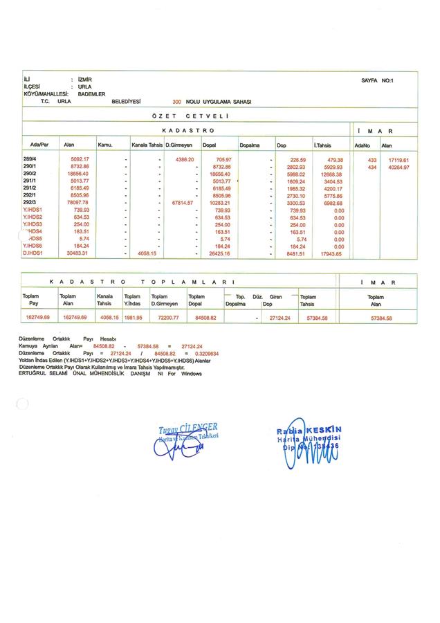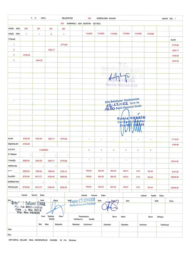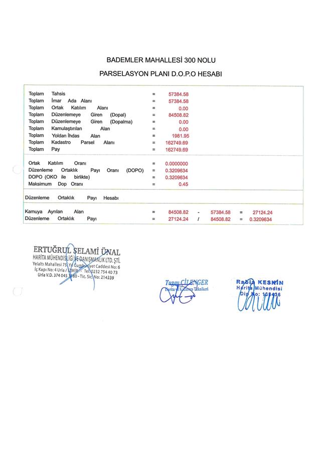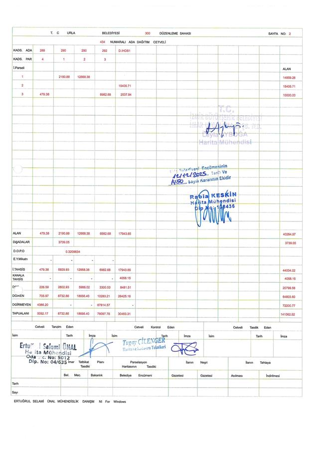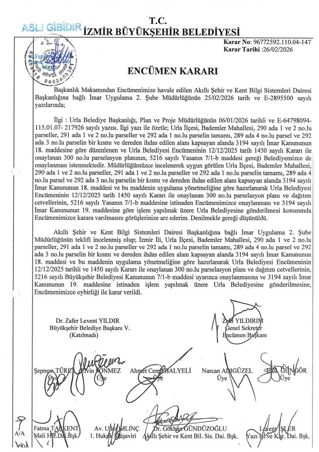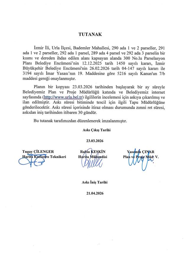 İzmir İli, Urla İlçesi, Bademler Mahallesi, 290 ada 1 ve 2 parseller, 291 ada 1 ve 2 parseller, 292 ada 1 parsel ile 289 ada 4 parsel ve 292 ada 3 parselin bir kısmı ve dereden ihdas edilen alanı kapsayan alanda 300 No.lu Parselasyon Planı Belediye Encümeni’nin 12.12.2025 tarih 1450 sayılı kararı, İzmir Büyükşehir Belediye Encümeni'nin 26.02.2026 tarih 04-147 sayılı kararı ile 3194 sayılı İmar Yasası’nın 19. Maddesine göre 5216 sayılı Kanun'un 7/b maddesi gereği onaylanmıştır.