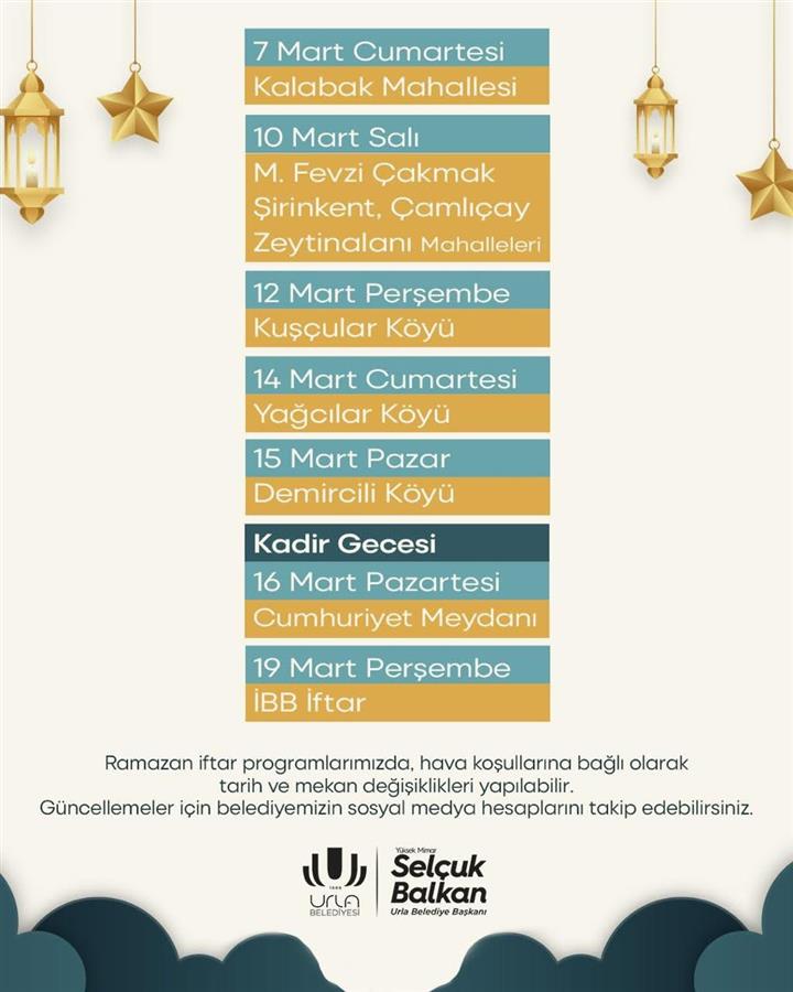 Belirlenen mahalle ve köylerimizde düzenleyeceğimiz iftar programlarında tüm vatandaşlarımızı aynı sofraya davet ediyoruz.